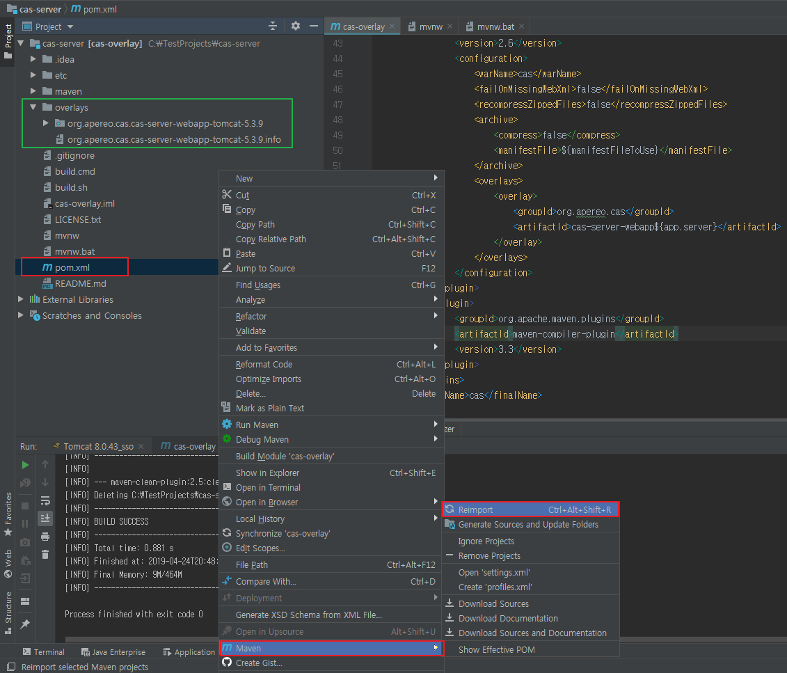 프로젝트를 실행하고 maven reimport(보통 pom.xml 파일이 있으면 maven 프로젝트로 설정된다.) 를 하게 되면 'overlays' 라는 github 사이트에서 확인할 수 없었던 디렉토리(녹색 박스)가 생겨난 것을 확인할 수 있다.