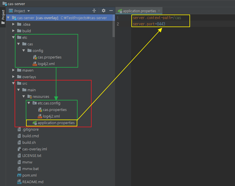 Port 8443과 Context-path /cas 는 application.properties 에서 설정했다.